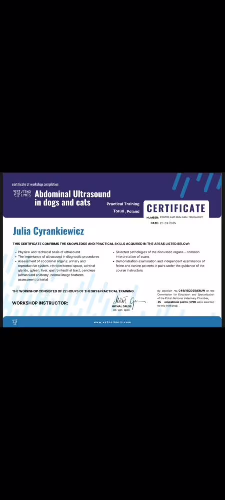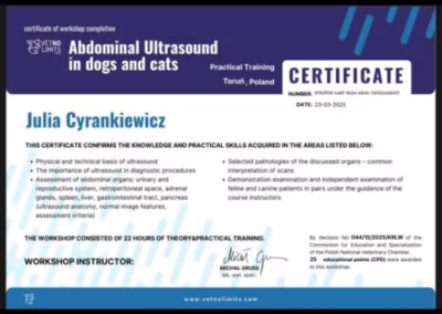 dr Julia na szkoleniu z Ultrasonografii jamy brzusznej psów i kotówkwi 22, 2025 | OgłoszeniaNasza kadra pracownicza udoskonala swoje umiejętności w różnego rodzaju szkoleniach weterynaryjnych.Kilka dni temu dr Julia Cyrankiewicz brała udział w szkoleniu z Ultrasonografii jamy brzusznej psów i kotów Starszy wpisNowszy wpis