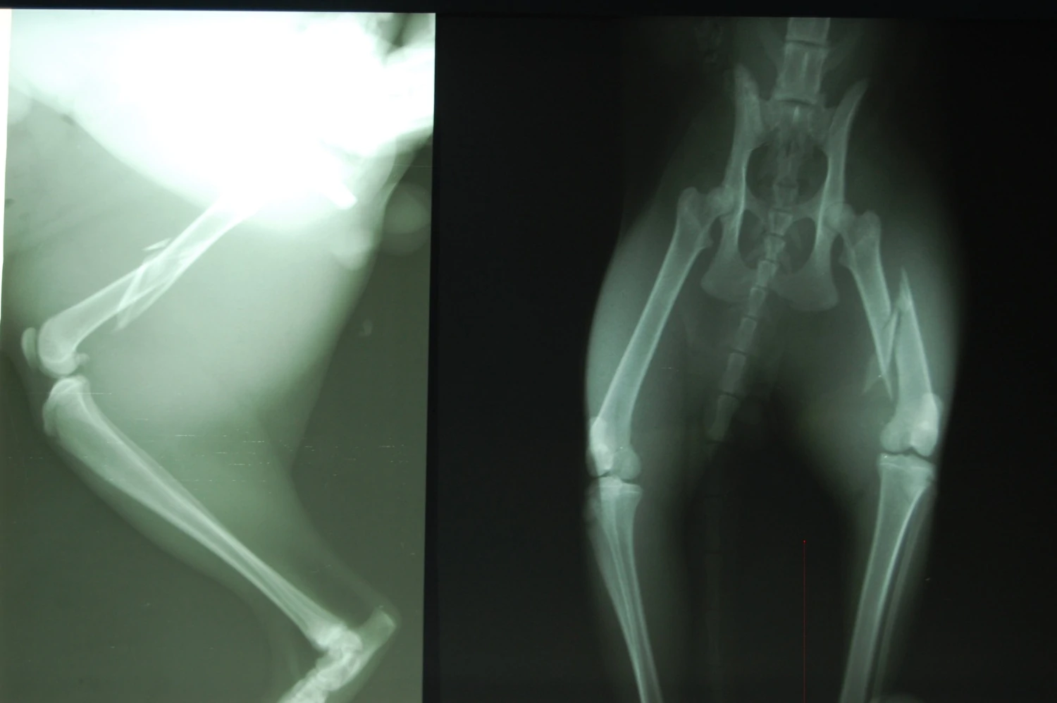 Kot, wiek 1 rok, wieloodłamowe złamanie trzonu kości udowej; operowany z zastosowaniem jednopłaszczyznowego stabilizatora wspartego ramą polimetyloakrylową w połączeniu z drutem śródszpikowym Kirschnera.