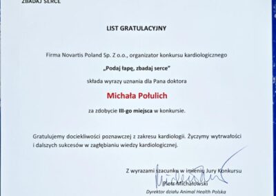 Z zamiłowania chirurg oraz kardiolog – diagnostyka i leczenie chorób serca z wykorzystaniem diagnostyki ultrasonograficznej metodą dopplerowską tzw. „echo serca”, elektrokardiograficznej (EKG), radiologicznej oraz laboratoryjnej, laureat trzeciej nagrody w ogólnopolskim konkursie poświęconym diagnostyce i leczeniu chorób serca Podaj Łapę Zbadaj Serce.