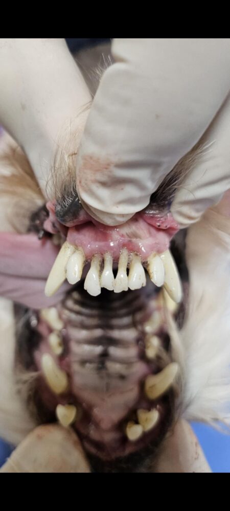 Na zdjęciu widoczne są odsłonięte szyjki zębowe – efekt zaawansowanej choroby przyzębia. Siekacze były już rozchwiane, dlatego musiały zostać usunięte, mimo młodego wieku psa.