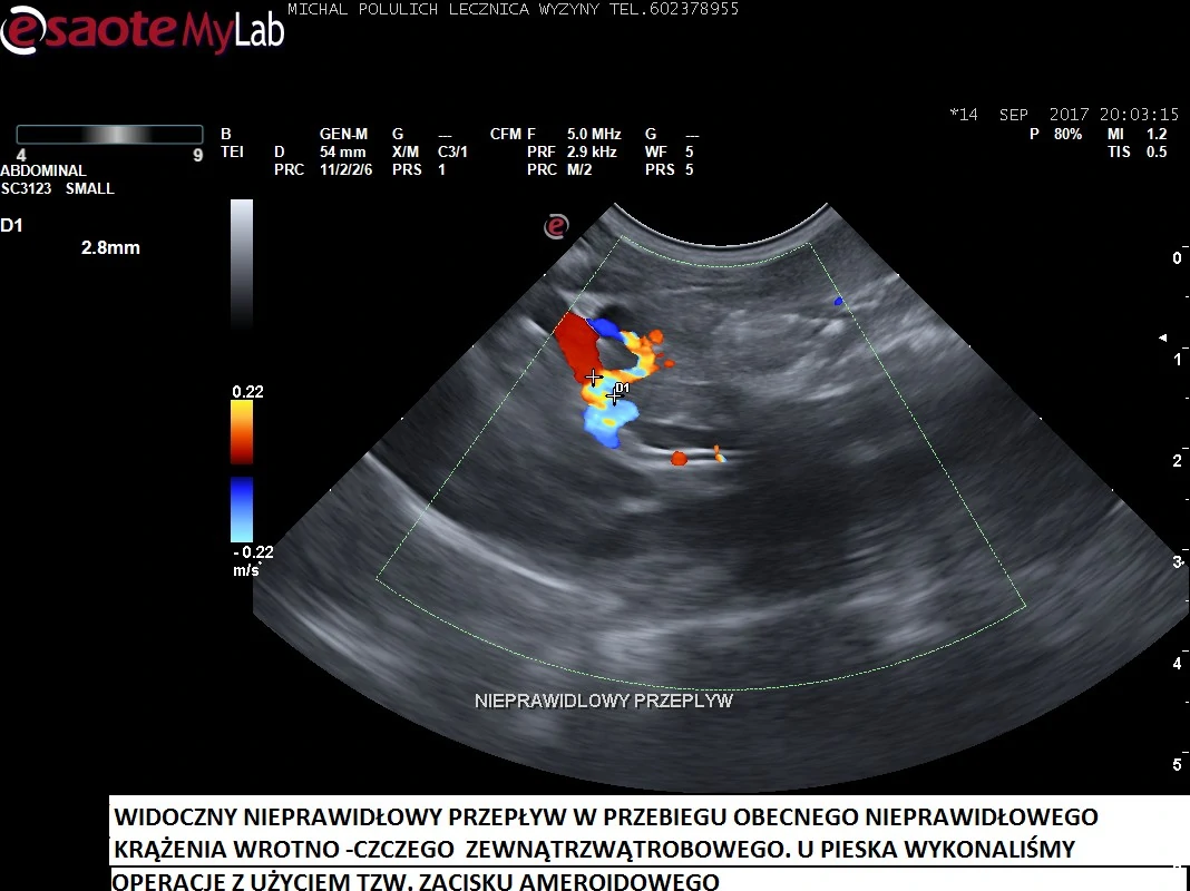 Nieprawidłowy przepływ w przebiegu krążenia wrotno-obocznego zewnątrzwątrobowego u psa. Wykonaliśmy u pacjenta operację z użyciem tzw. zacisku ameroidowego.
