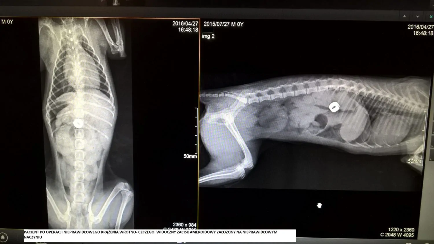 Pacjent po operacji nieprawidłowego krążenia wrotno-obocznego. Na zdjęciu RTG widoczny zacisk ameroidowy założony na nieprawidłowym naczyniu.